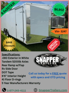 Welcome to Snapper Trailers, your premier source for dependable enclosed trailers built to meet a wide range of hauling needs. Whether you’re transporting classic cars, equipment, or commercial cargo, we’ve got you covered—from compact 4 × 6 SA models up to spacious 8.5 × 30 units. Specializing in car haulers and multi-purpose enclosed trailers, we deliver quality, versatility, and value every time. Explore our inventory or contact us today to find the perfect trailer for your job..