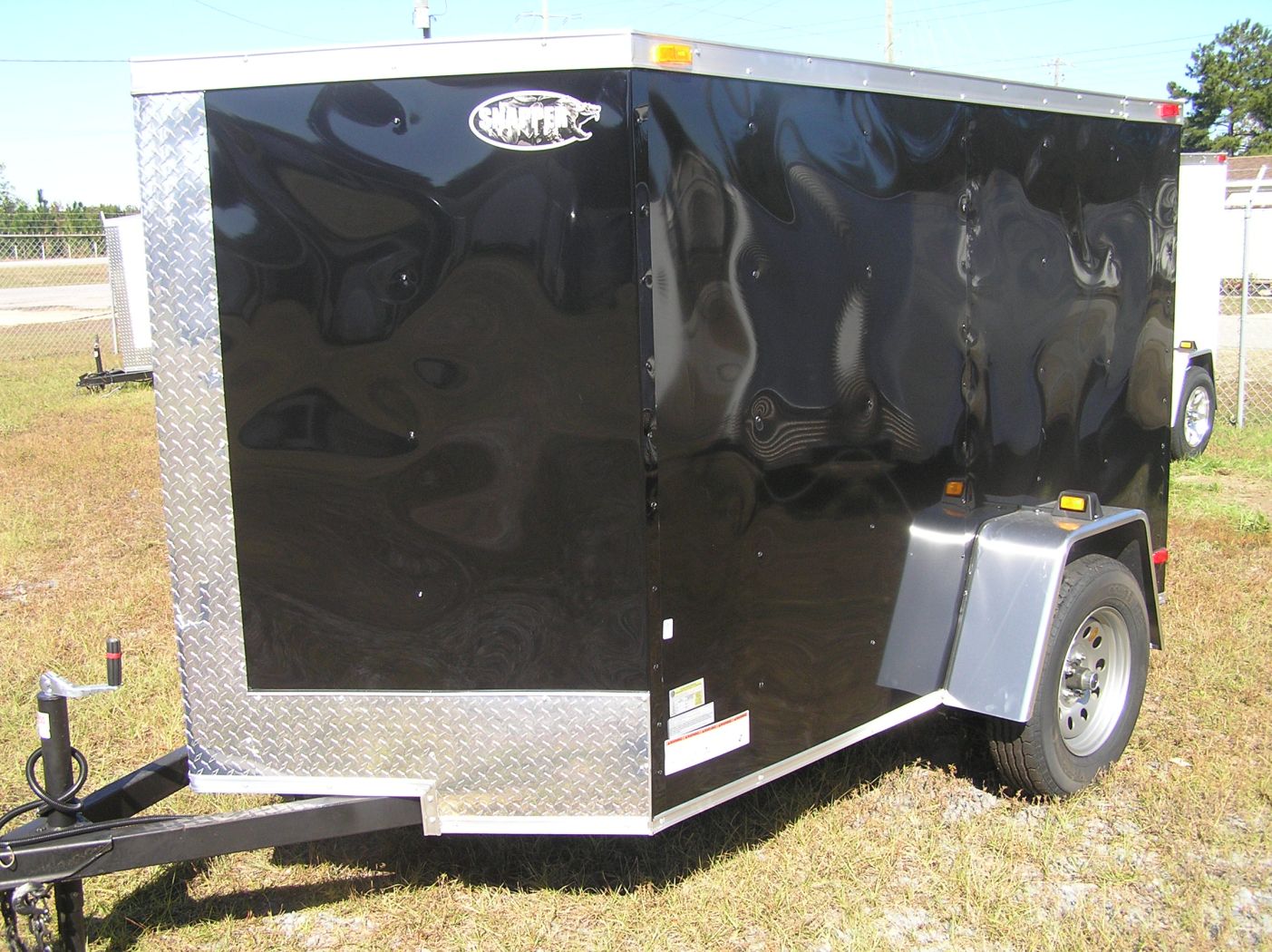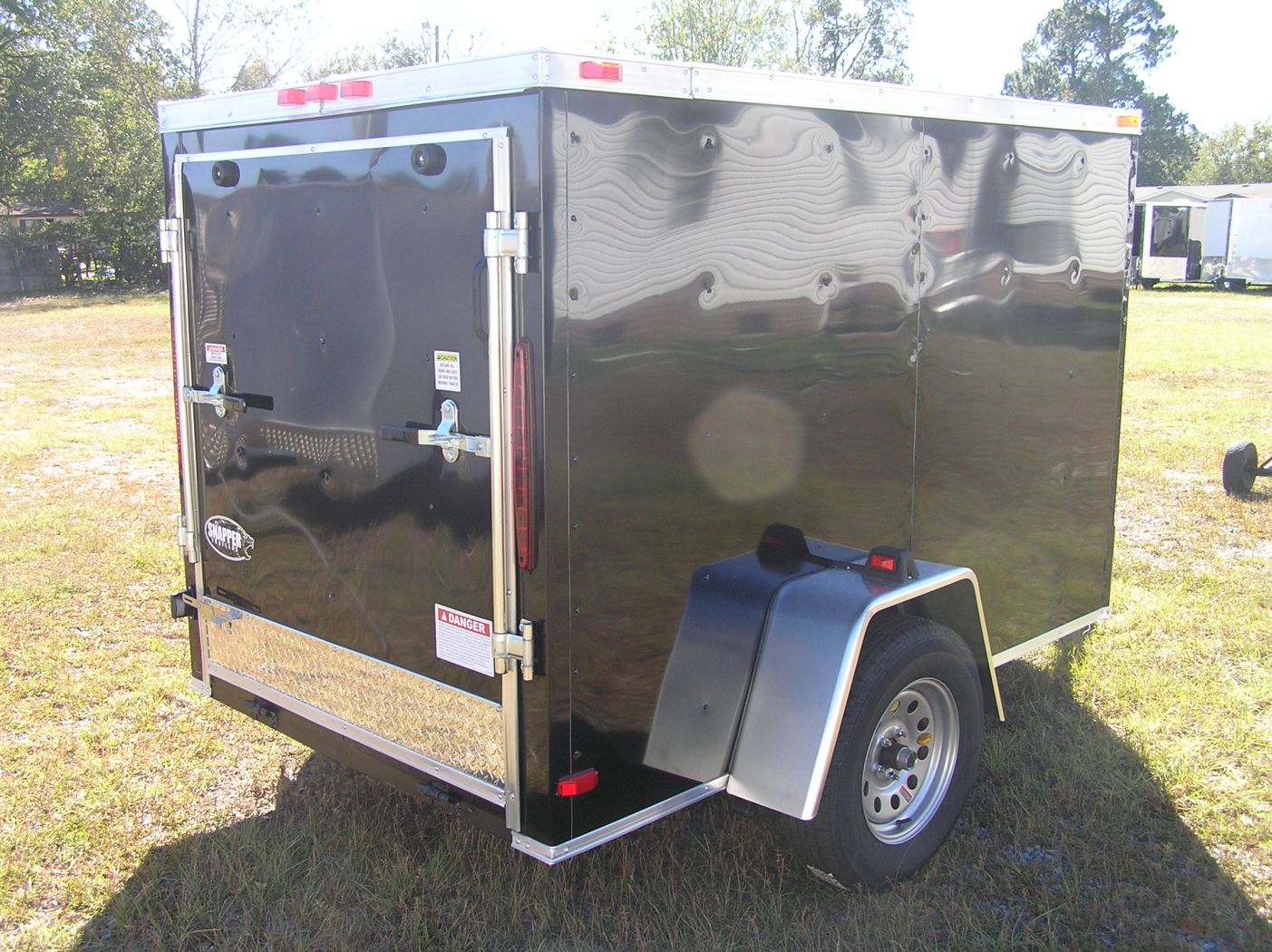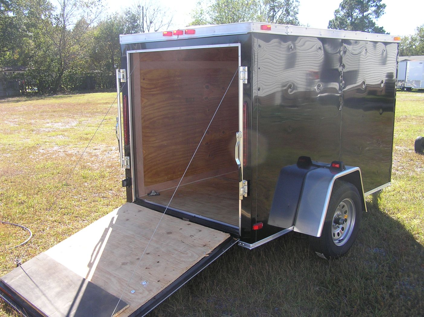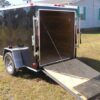 Midnight Black 5×8 single axle. Comfort low drag design with a Vfront. Plywood interior w/ a easy to use rear spring assisted ramp door w/ secure bar locks.