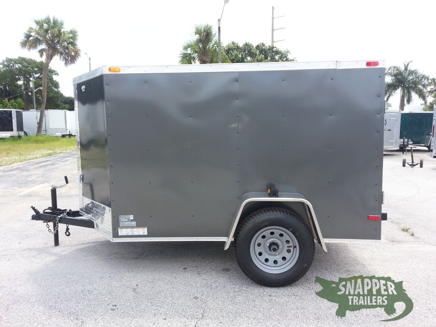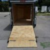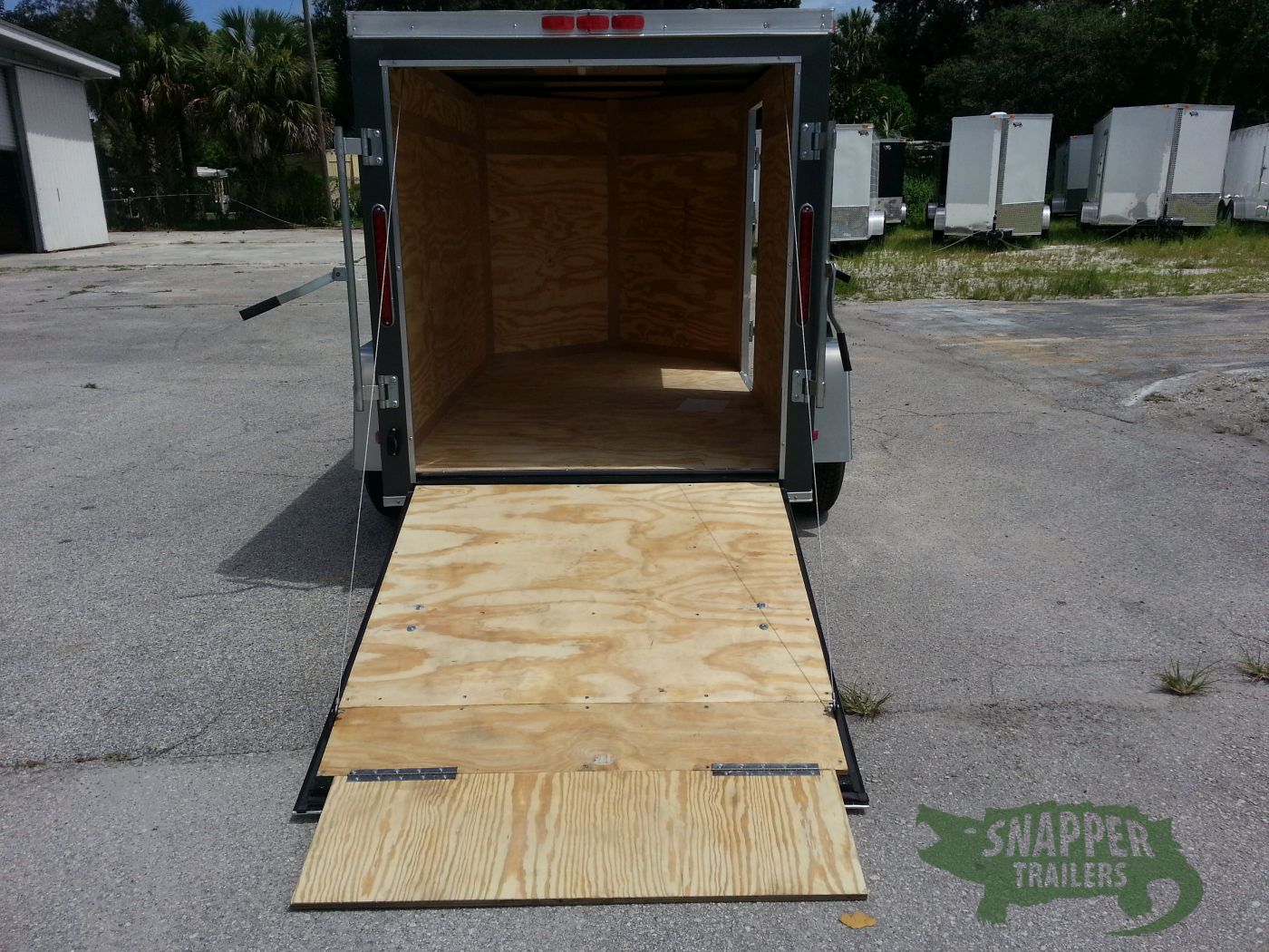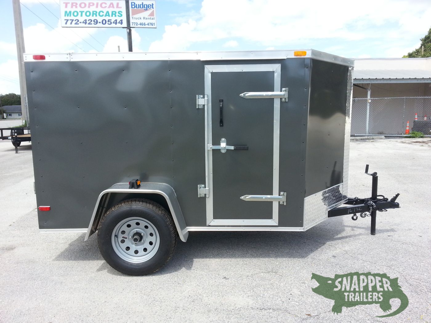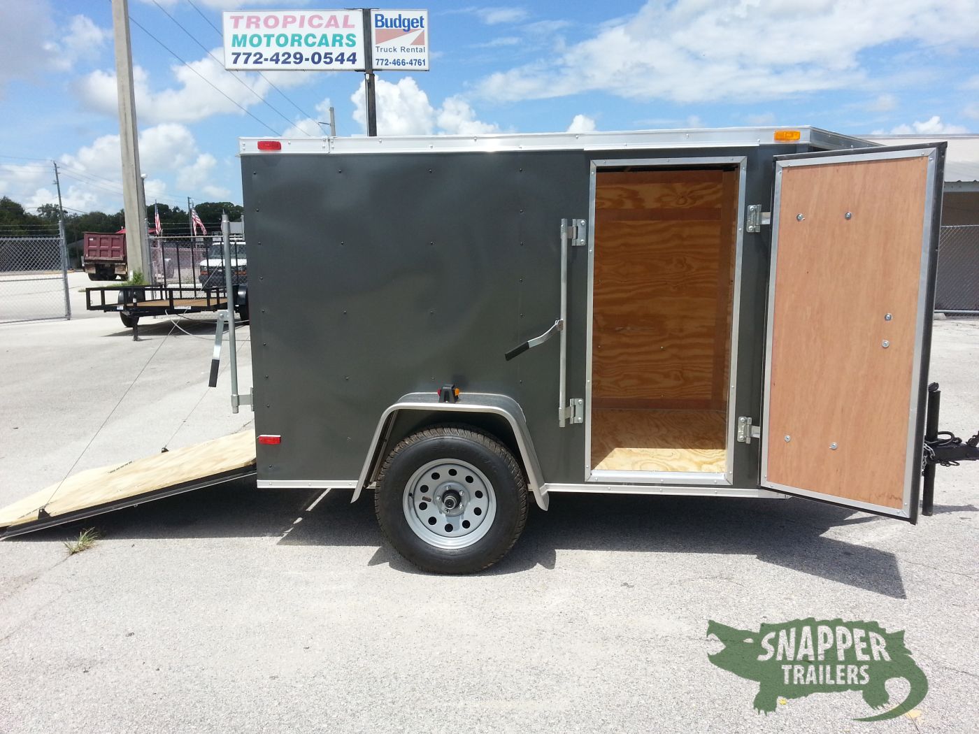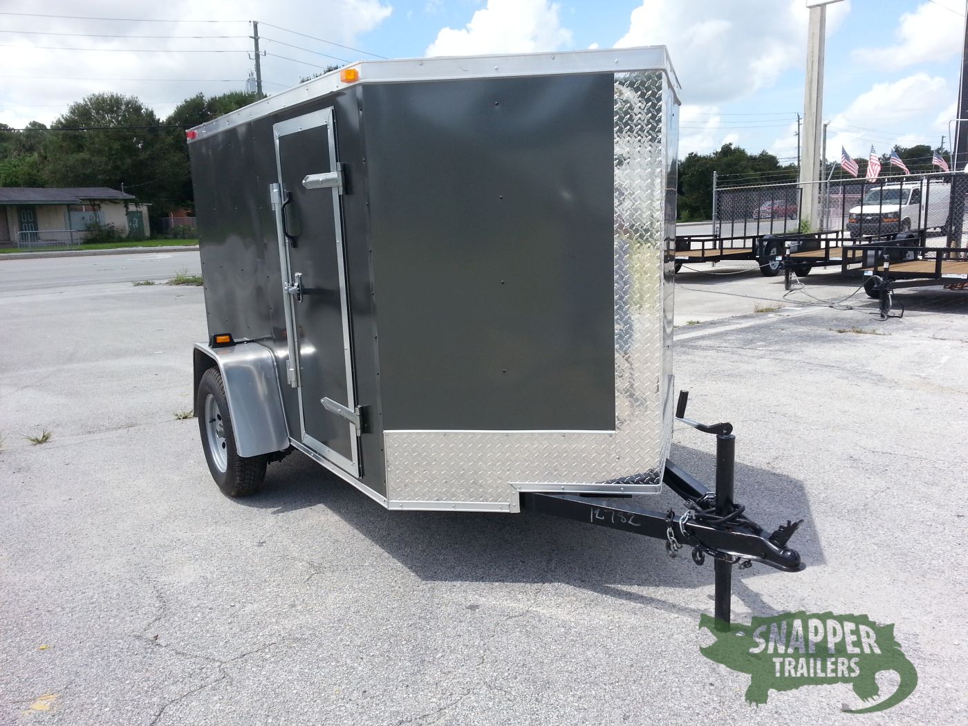 5ftx8ft Single axle multi purpose enclosed trailer put it in your garage. Charcoal Grey Exterior Rear Ramp Door convenient 24in Side door