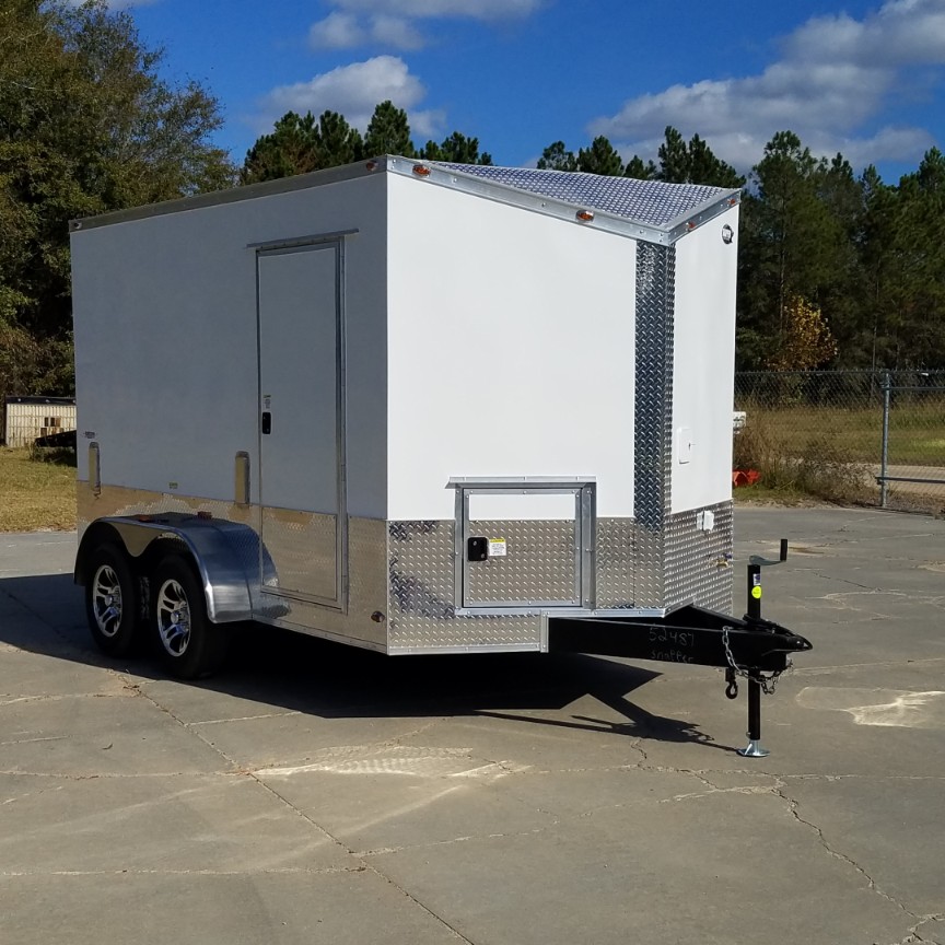 This little white trailer was specifically designed for quail hunting. Complete with custom cabinetry, washing area with hot water tank, rubber diamond plating flooring, escape hatch, extended ramp flap, electric package, water package, metal covered walls, v-nose front, and ceiling. Exterior upgrades including extended tongue, sloped v-nose, water nozzle, front piping access, upgraded ATP all around as well as some really nice mag wheels. Contact us today for a free quote or fill out the form below to make it nice and easy. #trailerspotlight #trailers